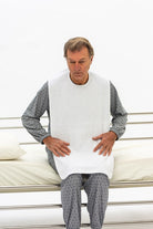 Babero de rizo hasta la rodilla con cierre autoadherente, sin lazos que crean problemas al lavarlo.