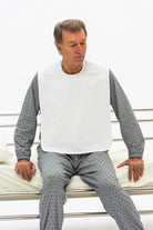 Babero de rizo de algodón laminado con poliuretano impermeable adecuado para evitar manchas en la ropa. Cierre de velcro en el cuello ajustable, longitud estándar.