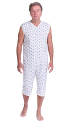 Pijama sanitario de manga corta y pantalón corto recomendado para personas con problemas de incontinencia y/o intolerancia a la ropa, debido a Alzheimer, demencia senil o discapacidad psíquica.