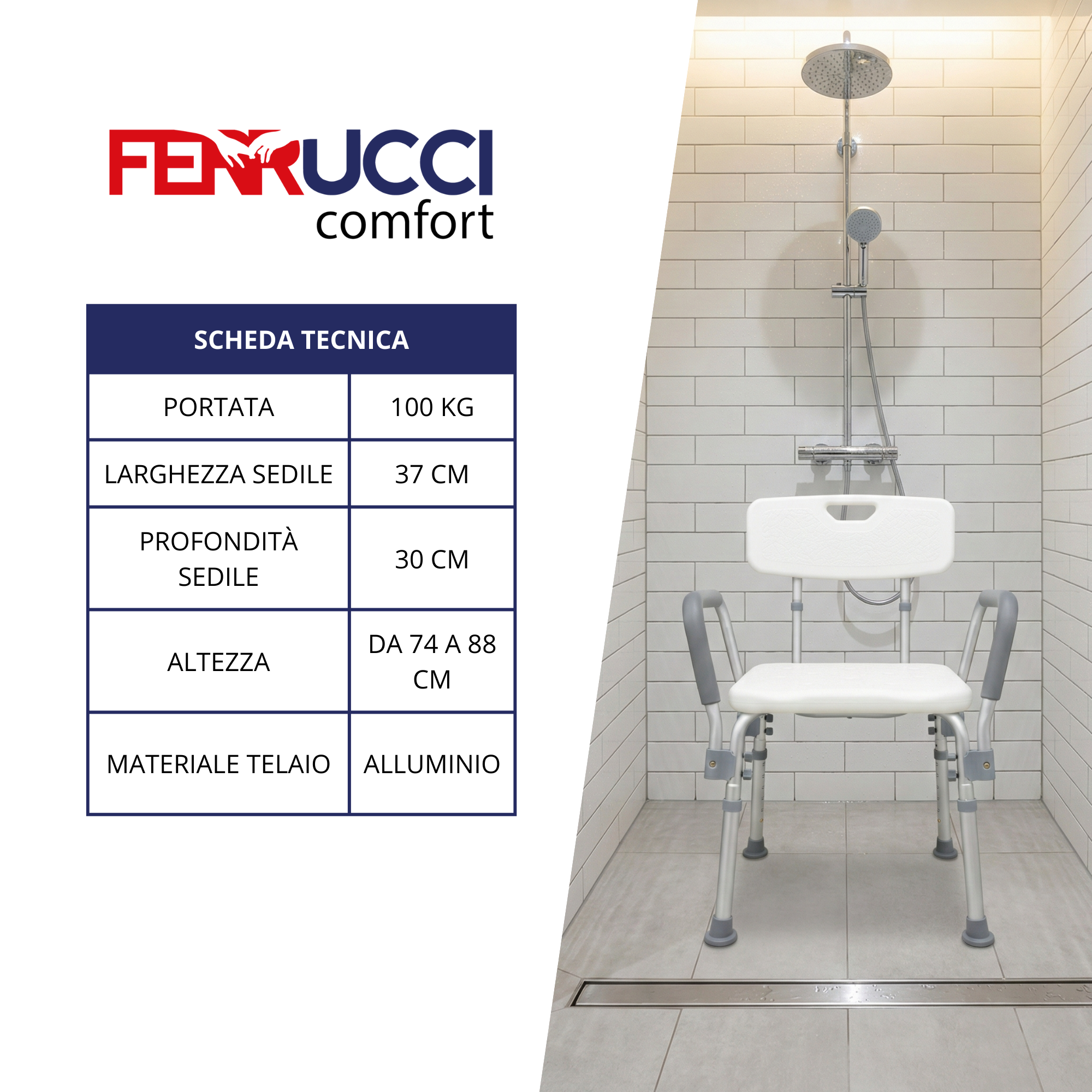 Seguridad y Confort en tu Higiene Diaria: La silla de ducha de Ferrucci Comfort ha sido diseñada para ofrecer el máximo soporte a personas mayores, con movilidad reducida o en procesos de rehabilitación. Su estructura ligera y su asiento ergonómico permiten disfrutar de una ducha relajante, eliminando el riesgo de resbalones y reduciendo el cansancio físico.