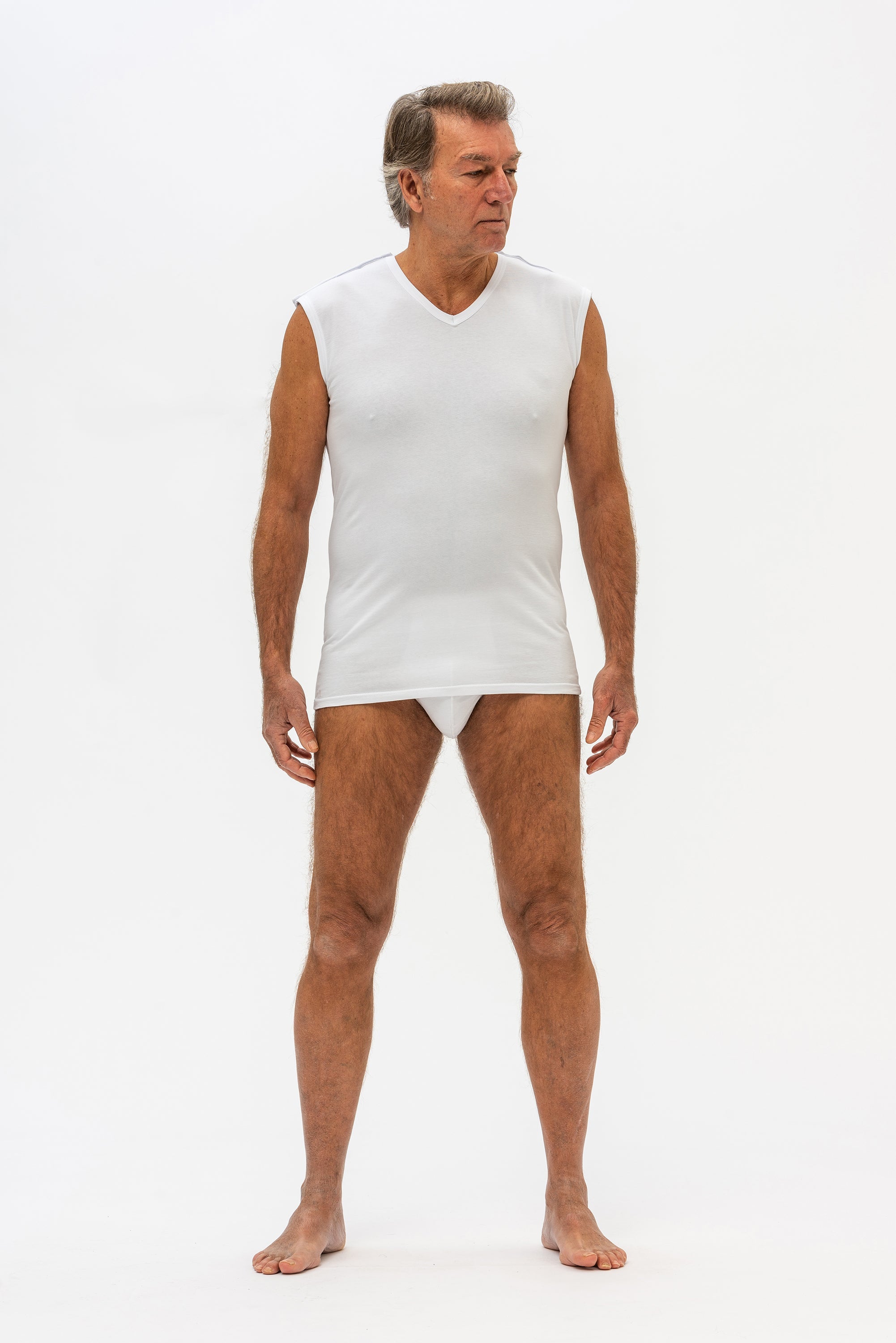 Prenda interior masculina de hombros anchos con tiras de velcro en ambos hombros.