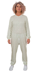 Pijama de geriatría tipo mono con cuello redondo, confeccionado en algodón 100% de alta calidad. Este modelo está diseñado específicamente para personas mayores, pacientes dependientes o personas con demencia/Alzheimer que presentan conductas de desvestido o manipulación de pañales.